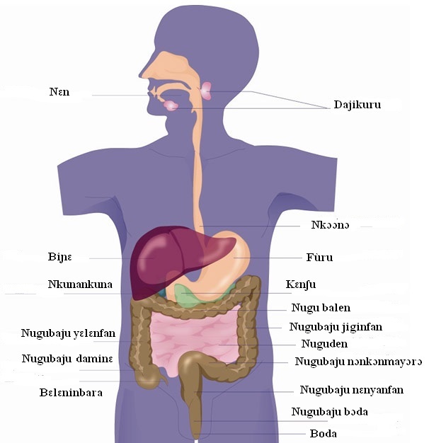 1 • ventre, bas-ventre. dɛ́bɛ, kɔ́nɔbara, kɔ́nɔfuru, kɔ́nɔ, bàrakɔrɔla, nàgakɔrɔla.