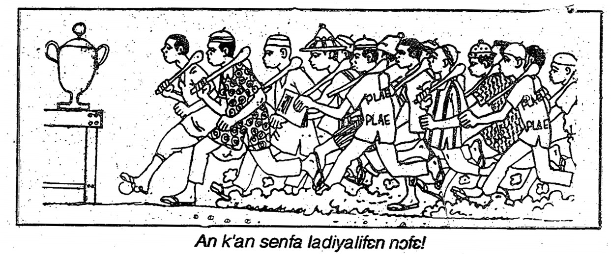 intj attention… cɛma can ! k'i biri dugu ma yabi ! jelema y'i jɔ a kunna ka pɛrɛn : “ saalugo ! saalugo ! saalugo ! sankanfɔ ani kalokanfɔ…(mariko-masunkulu.dis.html)